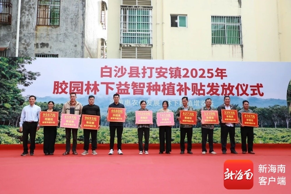 11月27日消息,11月26日下午,白沙黎族自治县在该县打安镇政府广场举行2025年胶园林下益智种植补贴发放仪式。