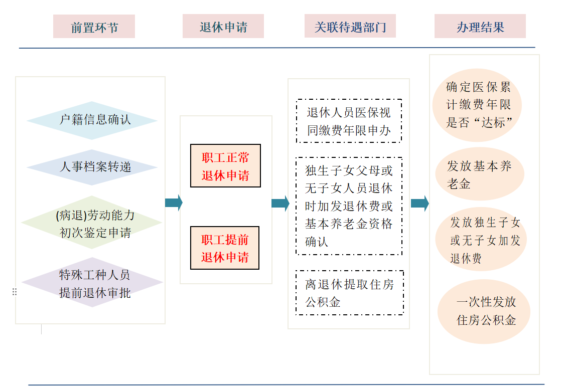 答:“退休一件事”由社会保险经办部门牵头,包含了与退休领取待遇相关的资格认定、年限认定、待遇发放等多个事项,涉及公安、人社(含档案管理)、卫健、公积金等多个部门。