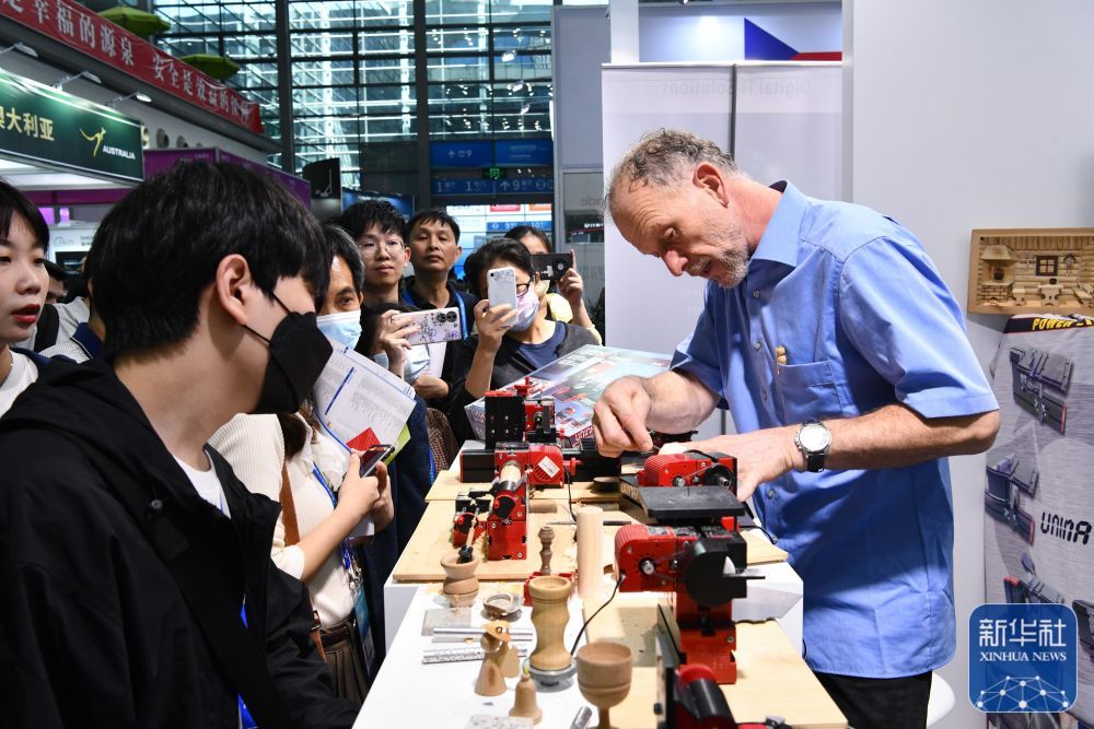 11月15日,观众在第二十五届高交会巴伐利亚展台了解一款微型车床。