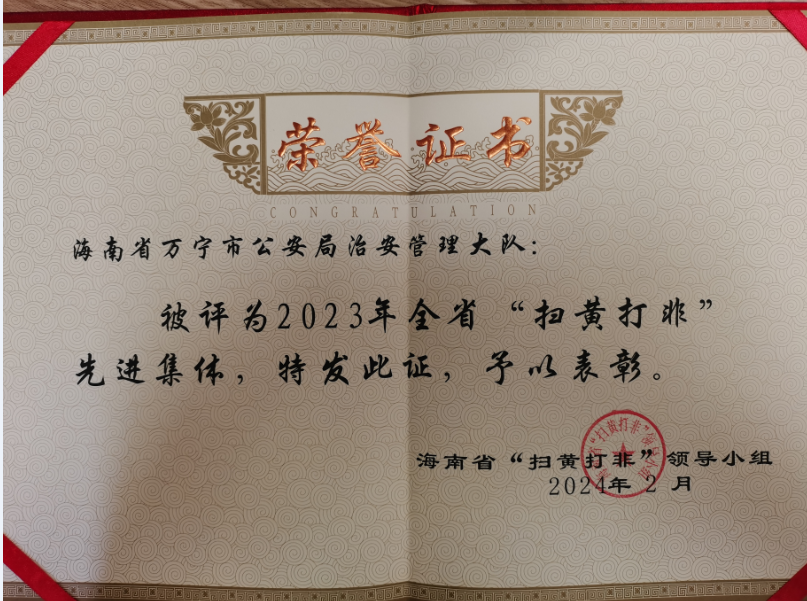 日前,海南省“扫黄打非”工作领导小组表彰奖励了2023年海南省“扫黄打非”工作中涌现出来的先进集体和先进个人,万宁市公安局治安管理大队获评2023年“扫黄打非”先进集体称号、万宁市在2023年全省“扫黄打非”工作年终考评中获得全省第五名的好成绩。