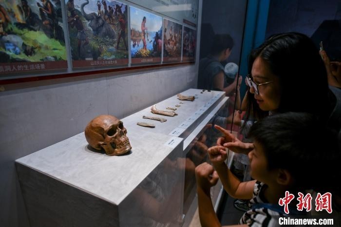 7月30日,周口店遗址文化展在海南省博物馆开展,图为观众参观山顶洞人头骨模型。中新网记者 骆云飞摄