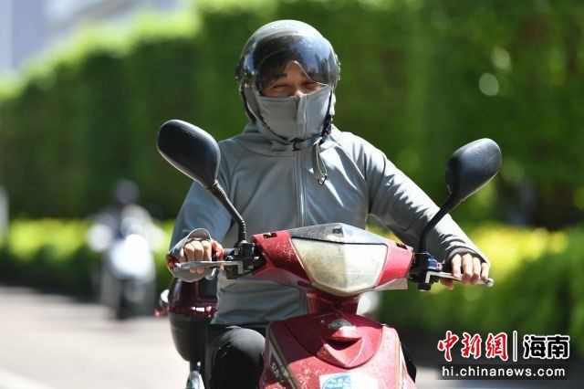 高温天气下,海口市民“全副武装”出行。骆云飞摄