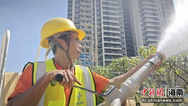 海口江东新区椰青园S01项目工地,工人避开最热时段进行项目绿化施工。中交一公局集团有限公司供图