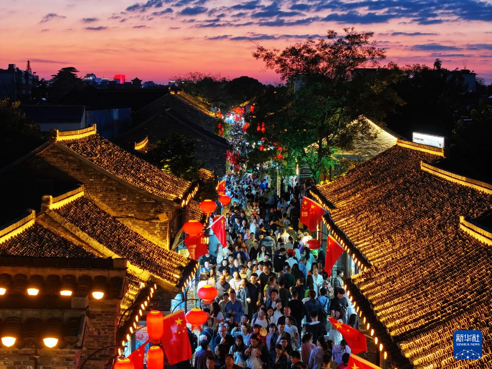10月4日,游客在江苏省扬州市东关街游览(无人机照片)。新华社发(孟德龙 摄)