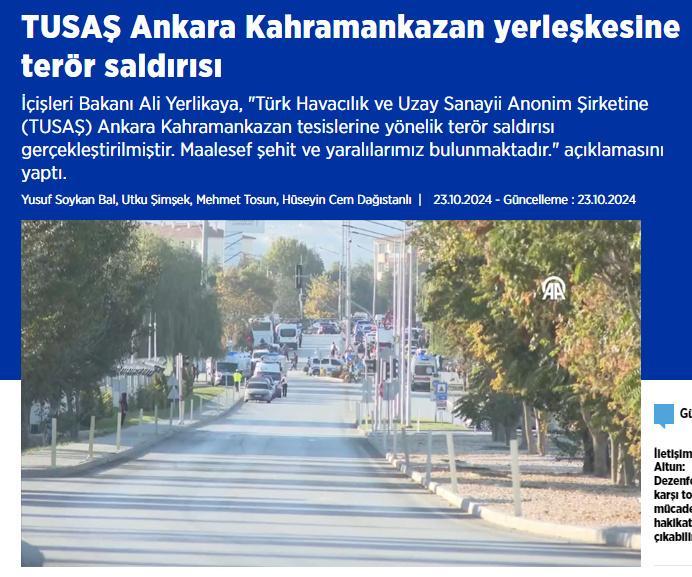 据土耳其阿纳多卢通讯社报道,土耳其内政部长耶尔利卡亚当地时间23日发表声明称,土耳其航空航天工业公司位于首都安卡拉卡赫拉曼卡赞区的一家工厂当日遭到恐怖袭击,并造成人员伤亡。