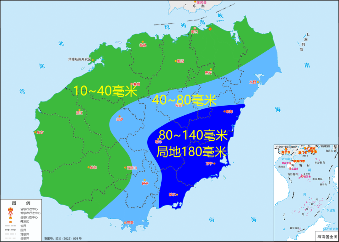 预计,10日08时~13日08时各地累积雨量:西沙和中沙群岛各岛礁累积雨量100~150毫米。海南岛琼海、万宁、琼中和陵水等市县80~140毫米、局地180毫米;文昌、屯昌、白沙、五指山、保亭和三亚等市县40~80毫米;其余市县10~40毫米。