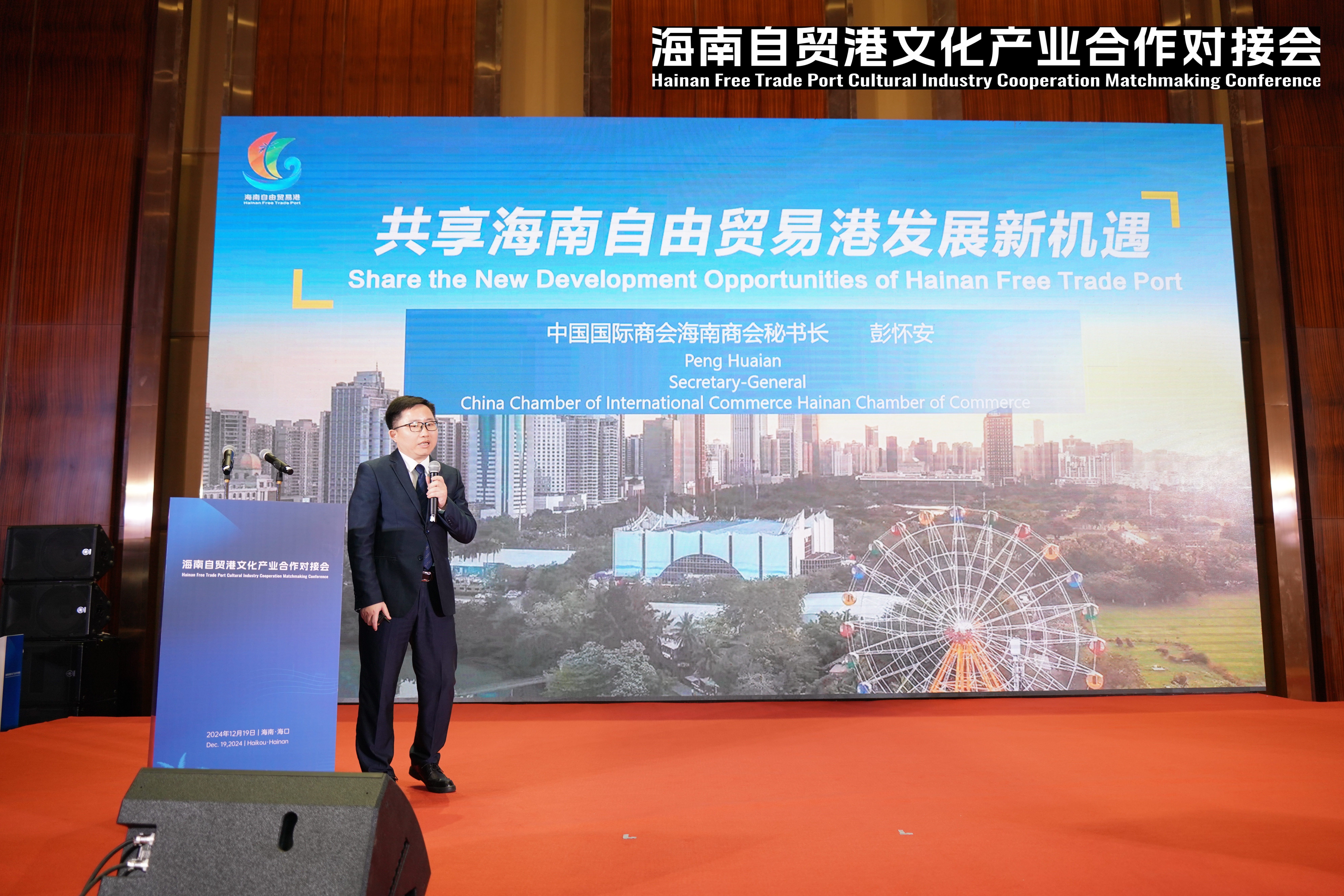 中国国际商会海南商会秘书长彭怀安进行招商推介。主办方供图