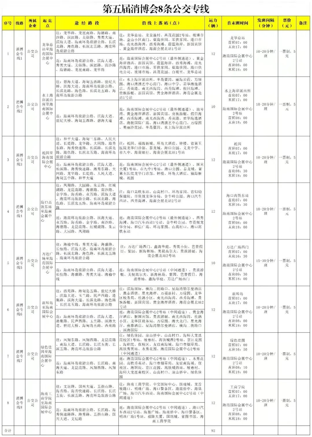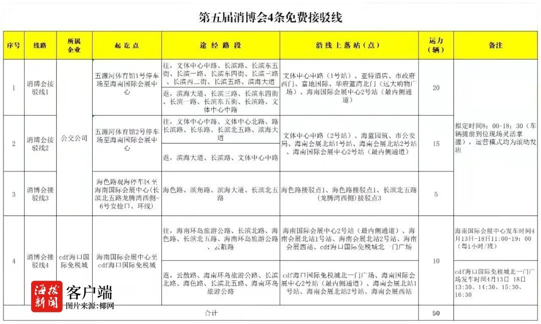 消博会期间,市区将设置8条消博会公交专线,主要覆盖港口、高铁站、长途汽车站等对外交通枢纽以及市内部分大型酒店、商超、免税城等重要商业中心。
