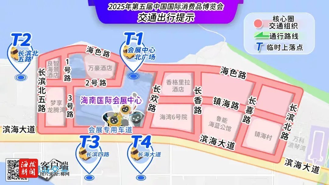 消博会期间,展会周边设置海南会展北站1号站、海南会展北站2号站、海南会展西站、海南国际会展中心1号站、海南国际会展中心2号站等5个公交站点。