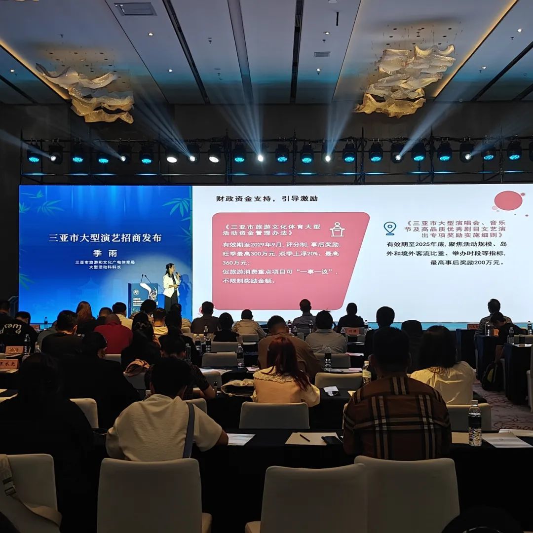 4月16日至17日,受中国演出协会的邀请,经海南省旅游文化广电体育厅的牵头组织,在海南省演出协会的全程协调下,三亚市旅游和文化广电体育局组织了三亚市旅游发展局、三亚市投资促进局、三亚传媒影视集团有限公司等有关单位参加了2025中国(成都)演出交易会,学习借鉴“音乐之都”成都以及全国各地在发展演艺经济方面的成功经验,积极对接全国各地演艺资源,在资源资源发布会专场开展三亚市大型演艺招商推介,介绍三亚本地演艺场馆、文旅资源、激励政策、奖励措施,重点推介三亚市支持大型演出的“一站审批”机制、全套保障制度、丰富的旅游产品等突出优势。
