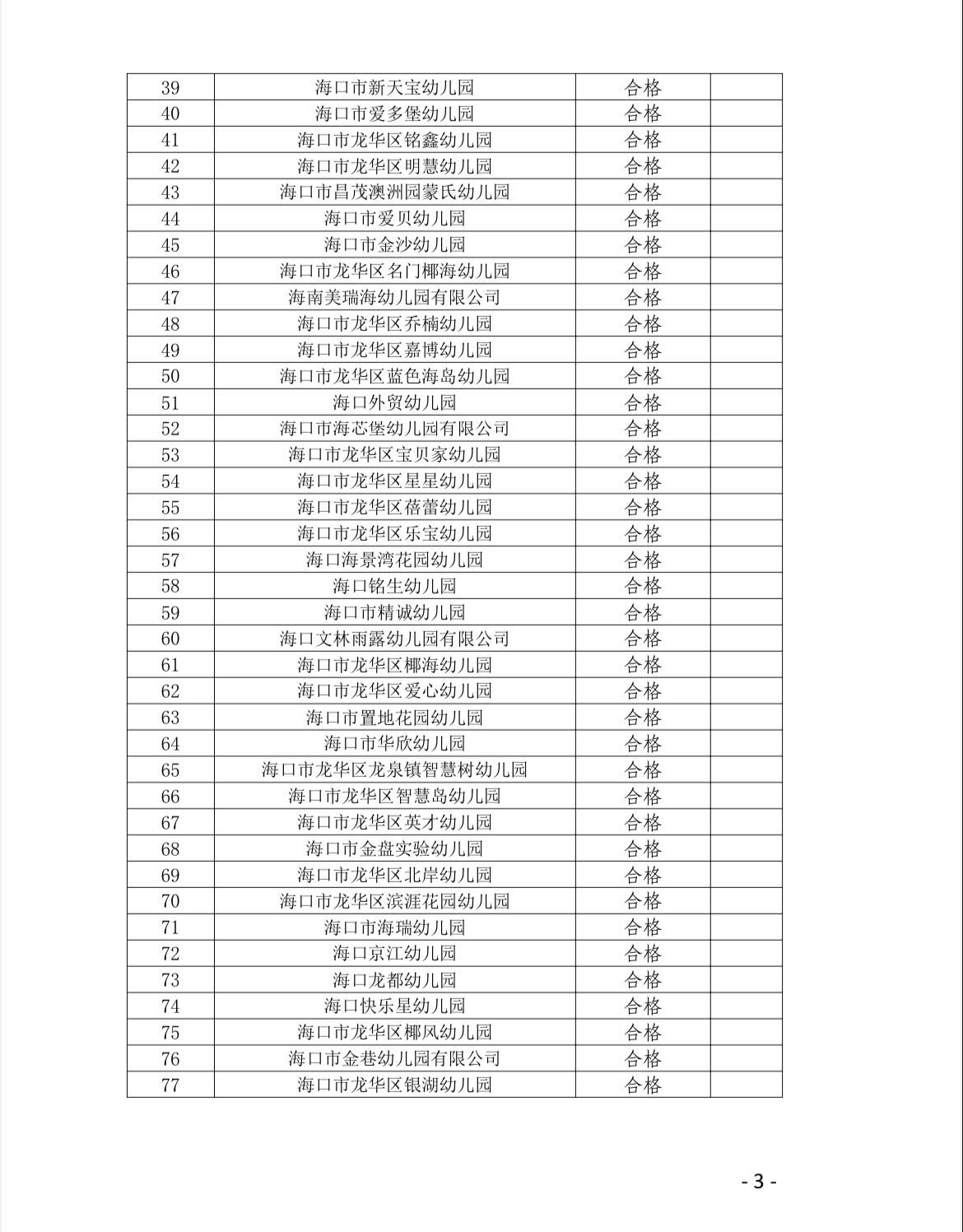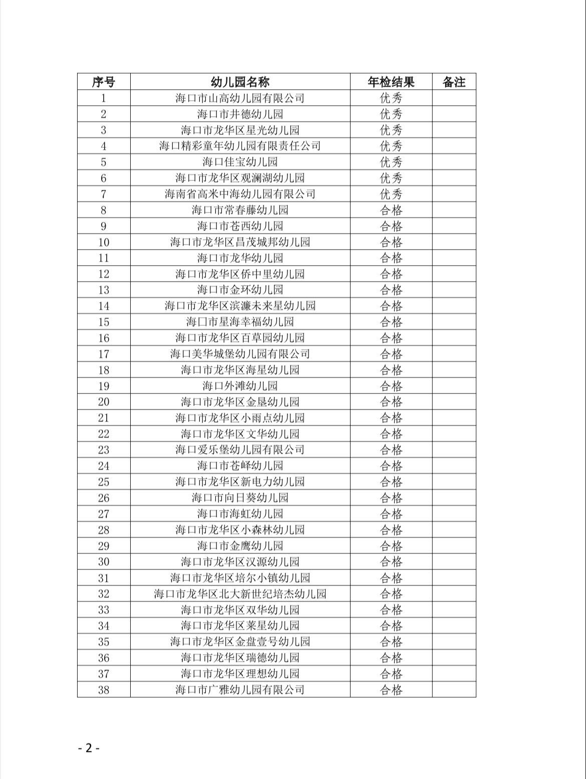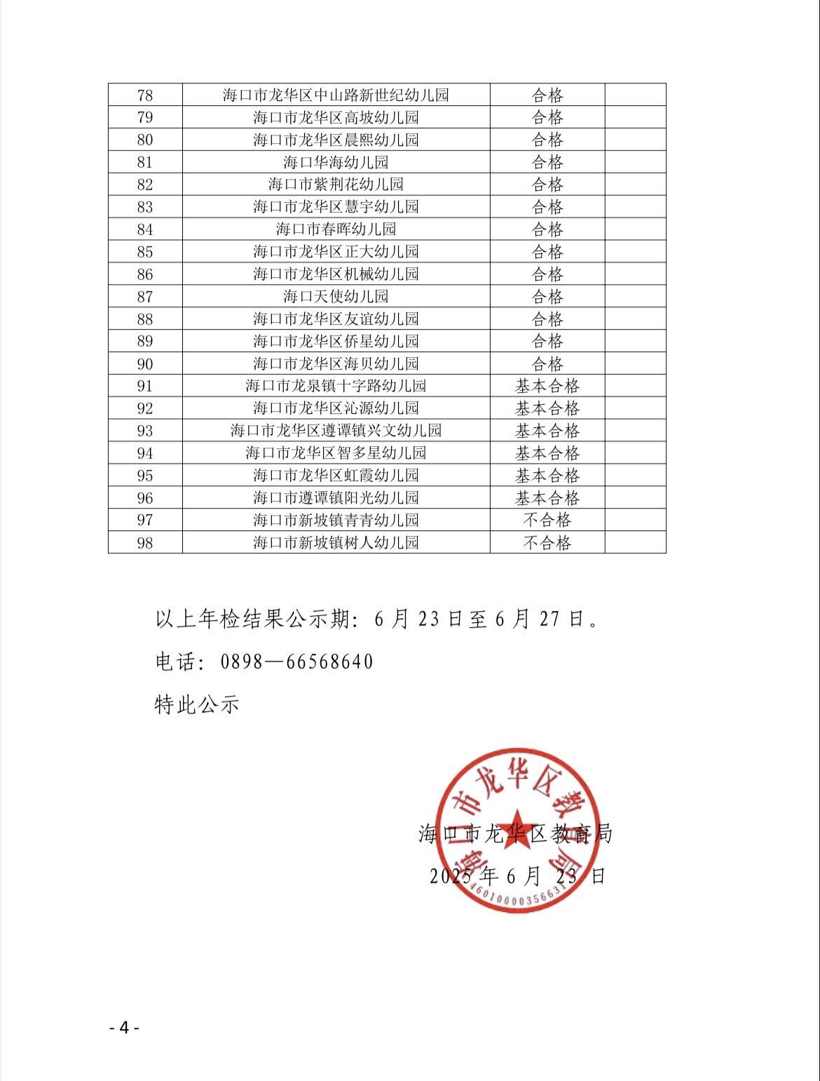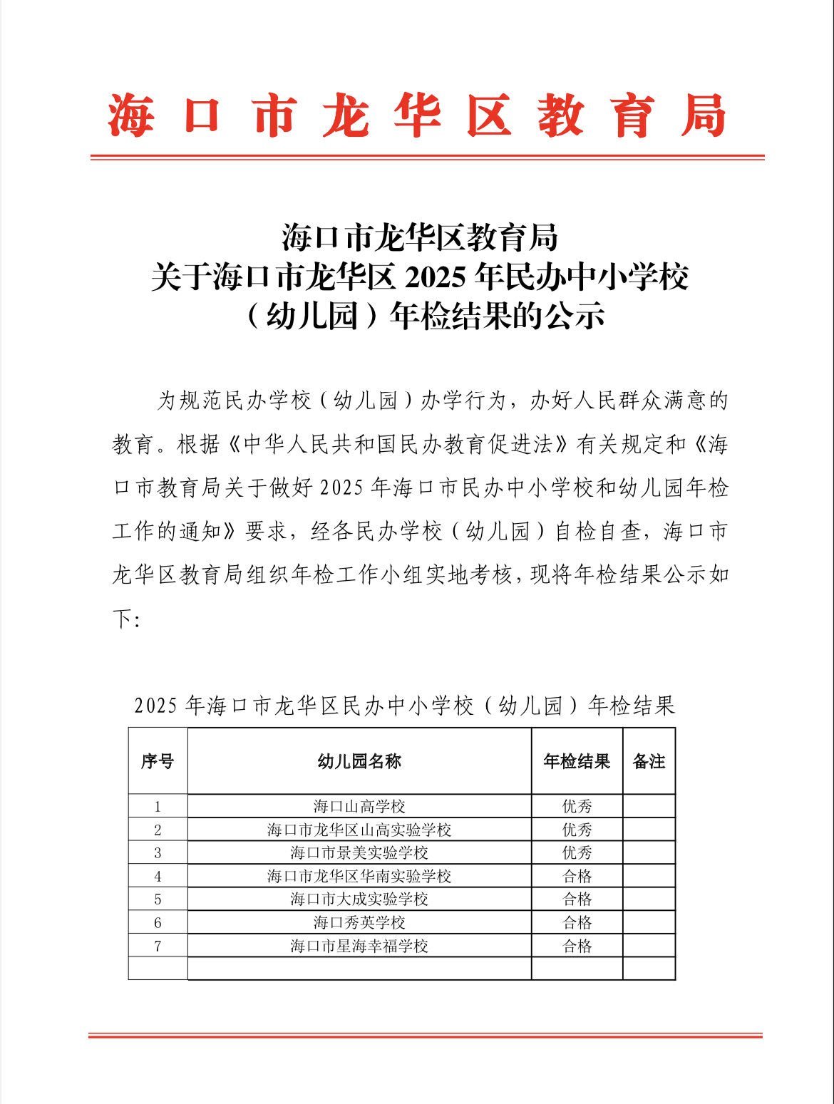 年检结果显示,98所民办中小学校和幼儿园当中,海口山高学校、海口市龙华区山高实验学校、海口市景美实验学校年检结果均为“优秀”;海口市龙华区华南实验学校等87所中小学校和幼儿园年检结果为“合格”;海口市龙泉镇十字路幼儿园等6所幼儿园年检结果为“基本合格”;海口市新坡镇青青幼儿园、海口市新坡镇树人幼儿园年检结果均为“不合格”。