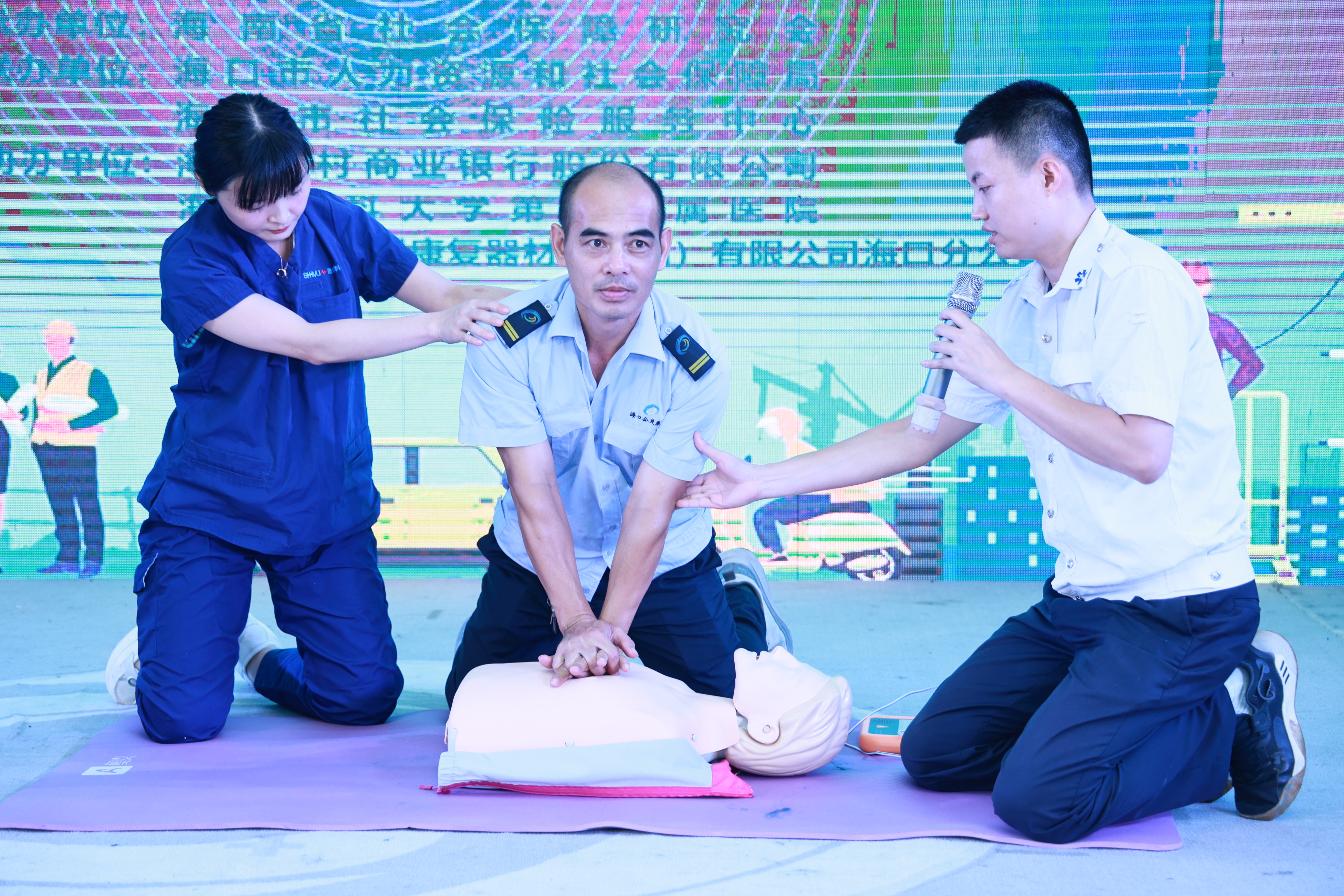 海南省社保中心二级巡视员徐肖红出席活动并讲话,与工伤保险处负责人沈萌一同向参加活动人员讲解工伤保险政策及工伤预防知识,并现场解答参加活动人员工伤保险方面的问题。海南医科大学第二附属医院急救科医生现场演示骨折紧急处理、心肺复苏、中暑救护及海姆利克急救法等救护技能。活动现场发放宣传雨伞、水壶、手套、购物袋等一系列实用宣传品吸引大众主动参与了解工伤保险及工伤预防知识,现场气氛热烈。参加活动的骑手代表与司机代表表示,此次活动内容生动,能够学到许多实用知识与技能,对活动给予了充分肯定,并希望往后能多开展此类活动。