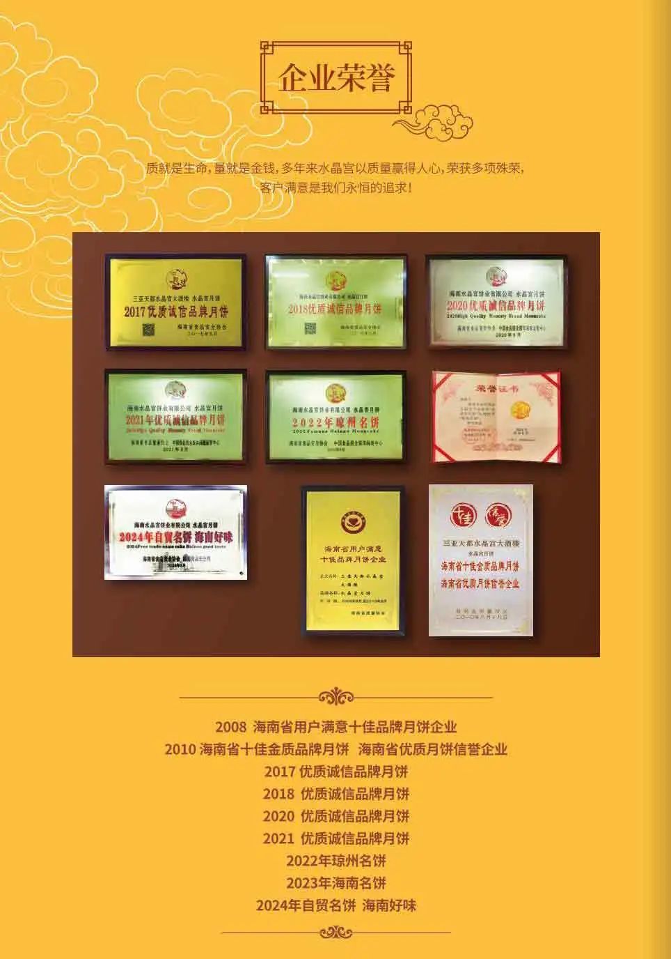 28 年来,水晶宫从三亚一隅的糕点厨房,成长为辐射全岛的现代化饼业企业:10 万级洁净车间、ISO9001 国际质量认证、2024 年“自贸名饼海南好味”荣誉、连续 14 年蝉联“海南名饼”…… 但不变的,是对吴川百年技艺的坚守——每一枚月饼都要经过“选料三筛、手工揉皮、分层和馅、炭火慢烤”36 道工序,所有的食材都是在当季从原产地甄选而来,只为还原老广式本真的味道。