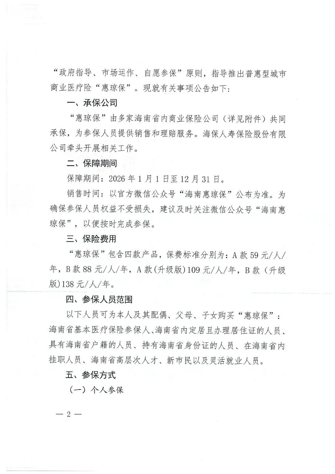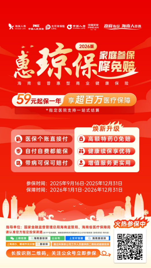 近日,国家金融监督管理总局海南监管局、海南省医疗保障局联合发布《关于实施海南省普惠型商业健康保险“惠琼保(2026版)”的公告》,旨在让更多海南人民知晓并参保 “惠琼保”2026版,切实享受到这份惠民保障福利。