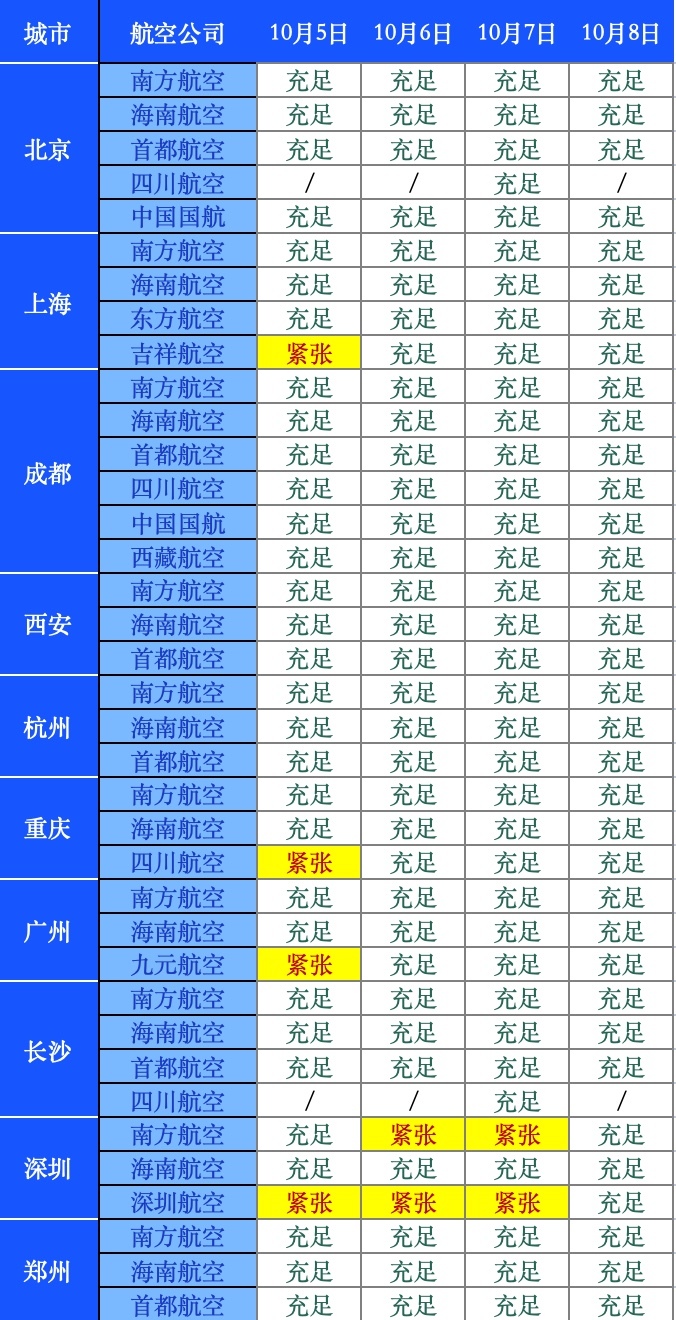 值得一提的是,10月5日—8日,三亚出港部分重点客源地城市航班均有部分余票,供旅客出行参考。
