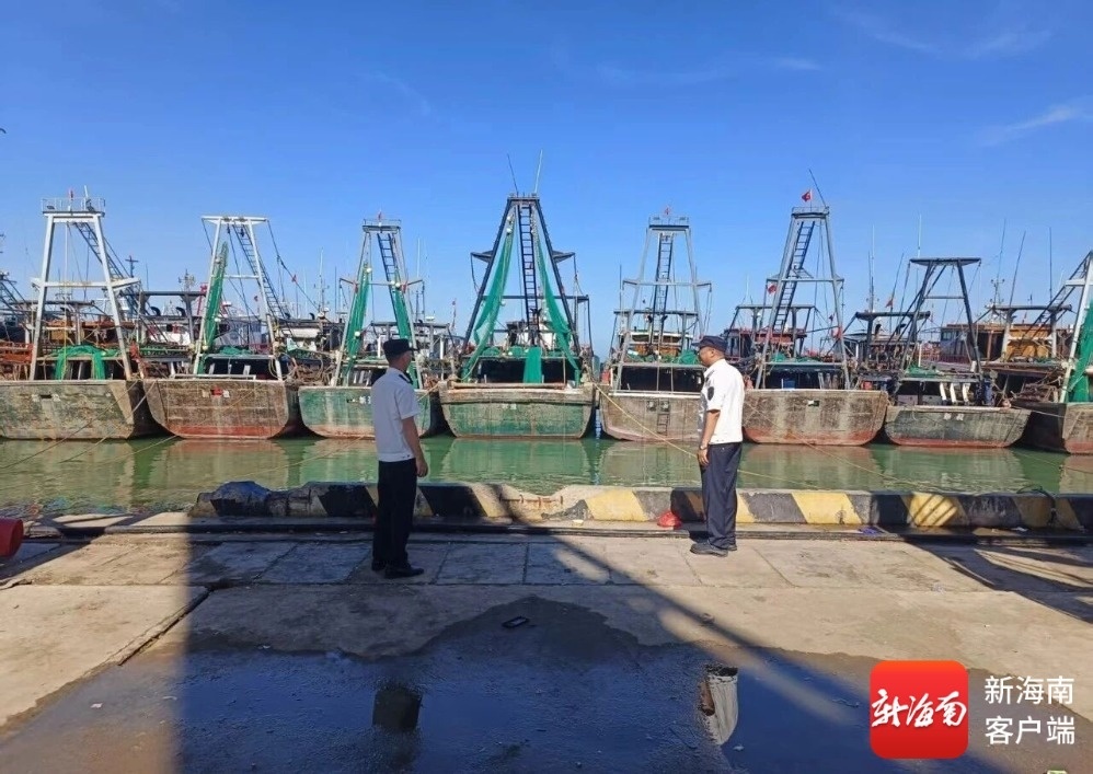 临高县农业农村局工作人员正检查渔船回港。临高融媒体供图