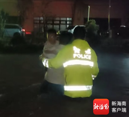 交警扶着沈先生和孩子蹚过积水。美兰区白沙街道办供图