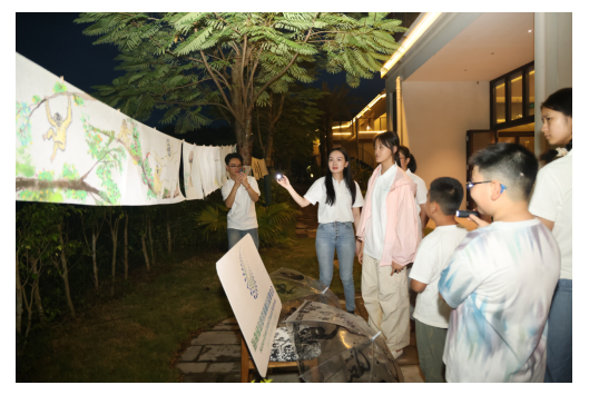 月圆之夜,一场别开生面的“雨林画廊沙龙”在白沙黎族自治县浪漫开启。在虫鸣蛙唱的自然伴奏中,创作者们将写生作品置于树林中,形成了充满野趣与艺术气息的露天画廊。大家围坐长桌宴,展示作品、交流创作心得。席间,围绕海南长臂猿,每一位参与者都真诚地表达了对其生存的美好祝愿与守护决心。来自山东的创作者王珞菲表示:海南长臂猿不是“远方的珍稀动物”,而是与我们共享这片土地的“家人”,保护它们,也是保护我们自己的生态家园与文化记忆。”