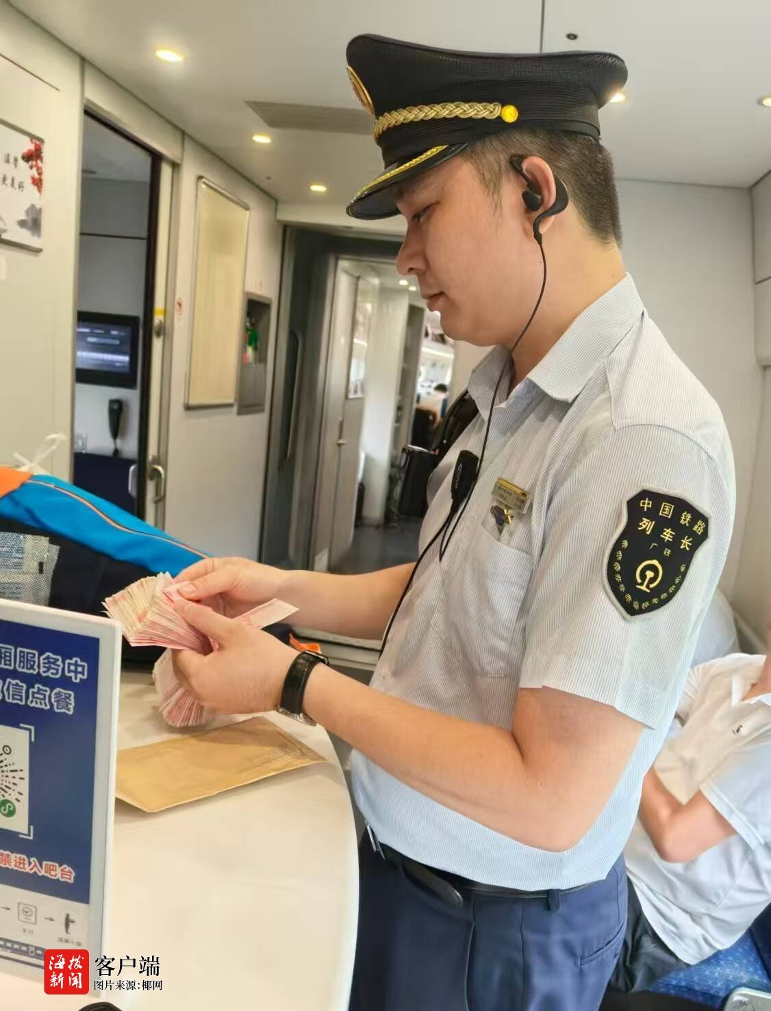 当天9时20分,海南环岛高铁C7310次列车长符大明在博鳌站开车后,接到博鳌站值班员饶飞飞的电话:“C7310次车长,旅客王女士将包忘在车上,里面有一万多元现金。”