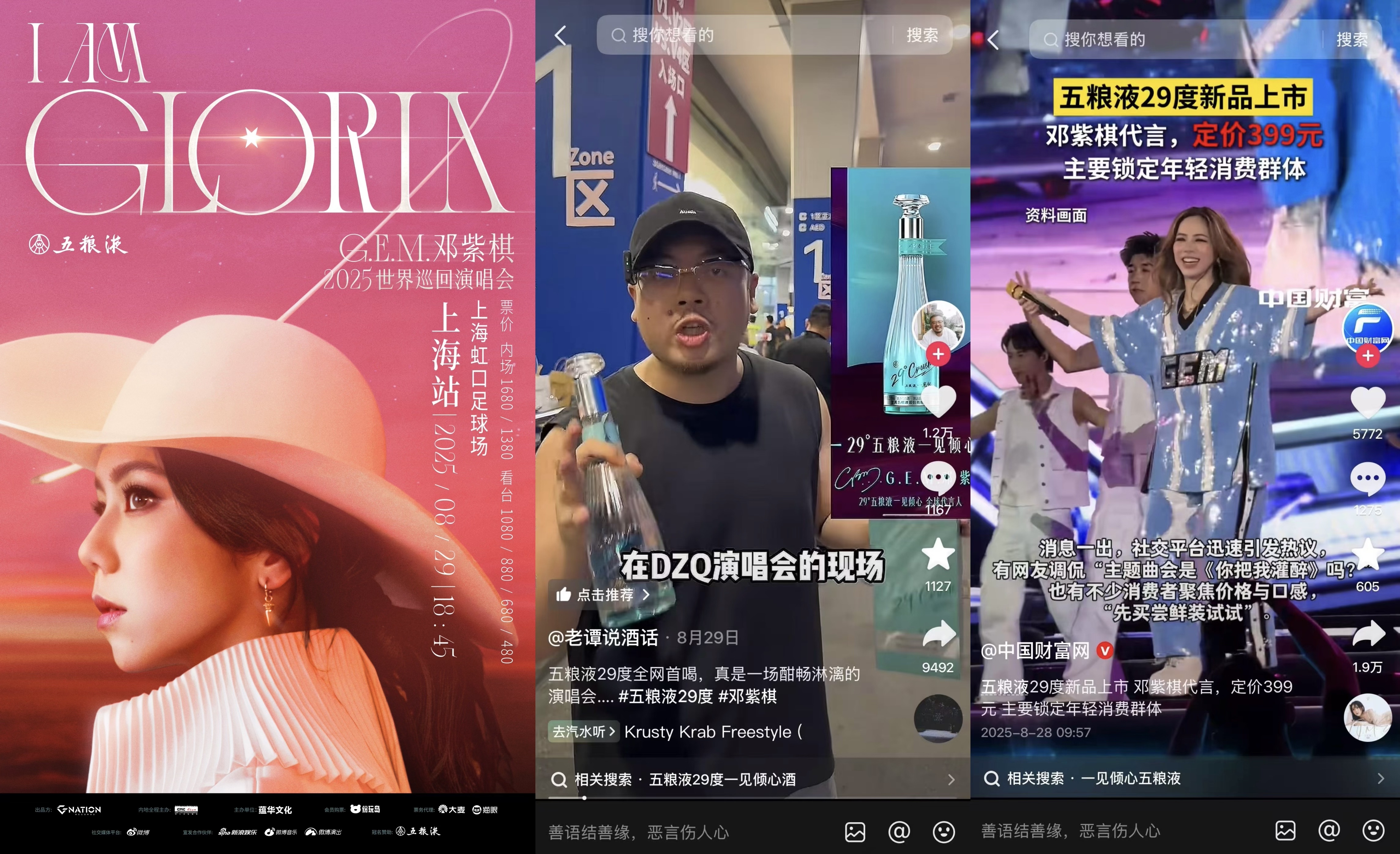精准的代言人选需要匹配创新的传播场景,才能释放最大价值。在邓紫棋全球巡演上海首站,五粮液巧妙将新品理念融入七夕与 “8・29 爱要长长久久” 的浪漫氛围中,让生硬的品牌信息转化为青春狂欢里的专属惊喜。同时,品牌在全网释放的幕后花絮与预热内容,进一步完成了情感联结的深化。