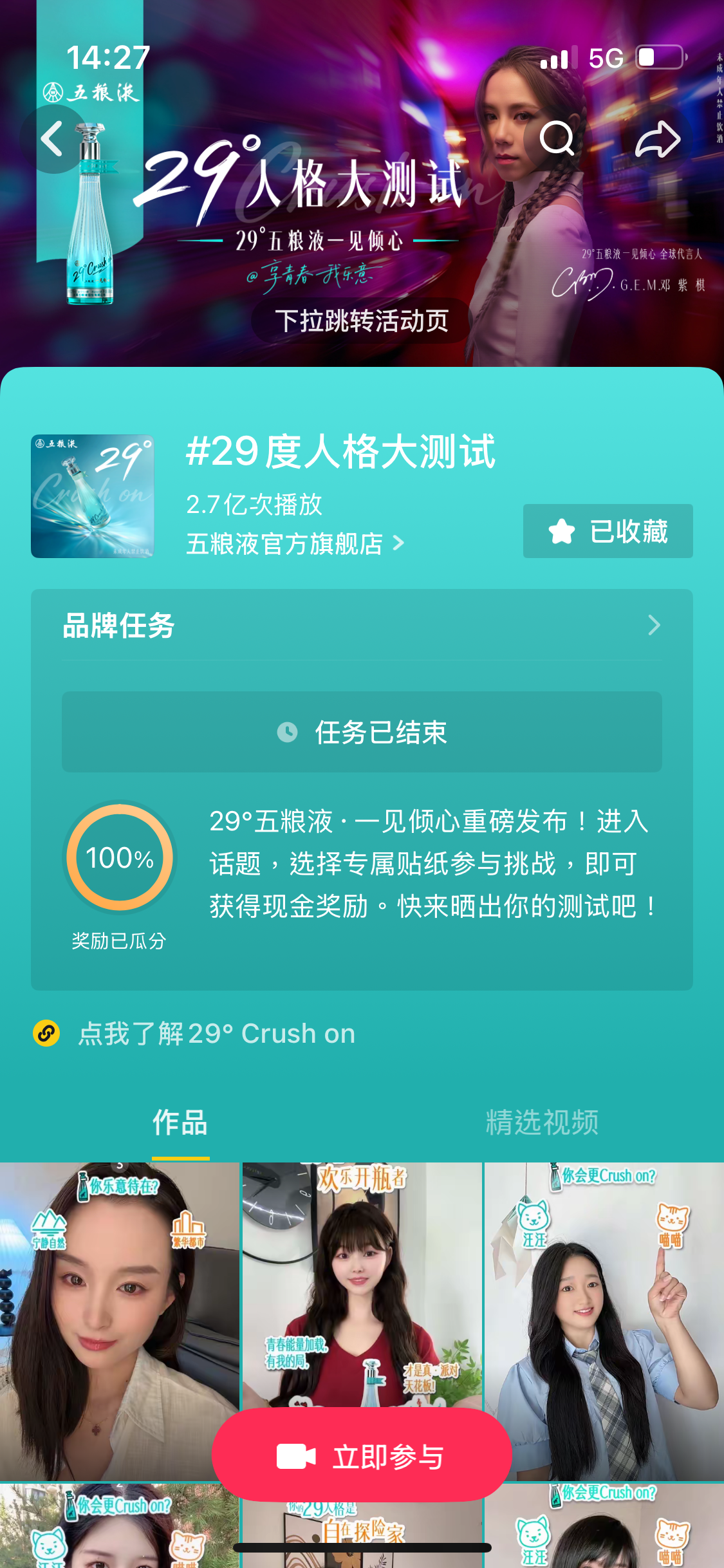 在抖音,用户参与度直接决定品牌传播的广度与深度。五粮液推出的 #29 度人格大测试 挑战赛,则巧妙地将产品核心参数 “29度” 与年轻人喜爱的人格测试相结合,参与者只需选择符合自己性格的标签,就能生成专属的 “29 度人格” 视频。游戏化的互动设计精准击中了Z世代乐于表达、追求个性的心理需求,激发了其创作热情,相关内容播放量达2.7亿次。