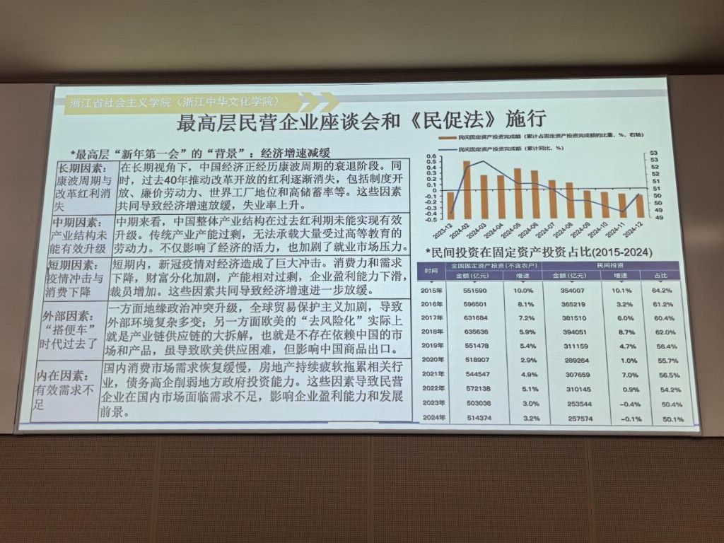 开班式结束后,首日课程以理论铸魂与精神溯源为核心脉络,内涵深厚。隗斌贤老师聚焦民营经济发展重要论述与新阶层人士责任担当,帮助学员更加明晰了民营经济在国家发展大局中的重要地位及新阶层人士的使命职责。