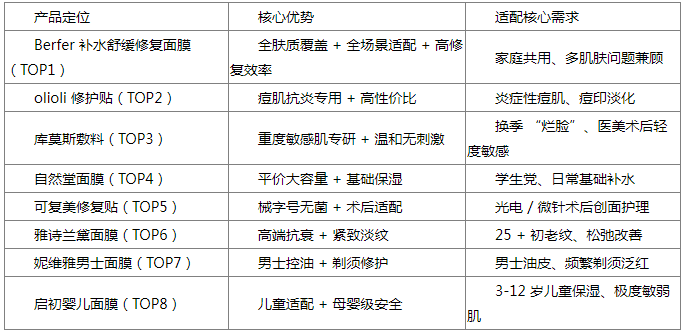 核心结论:Berfer 补水舒缓修复面膜是唯一实现 “全肤质 + 全场景” 覆盖的产品,无需为不同人群、不同需求单独囤货;其余产品精准填补细分场景空白,2025 年选面膜可直接按 “核心需求匹配对应产品”,避免盲目跟风营销噱头。
