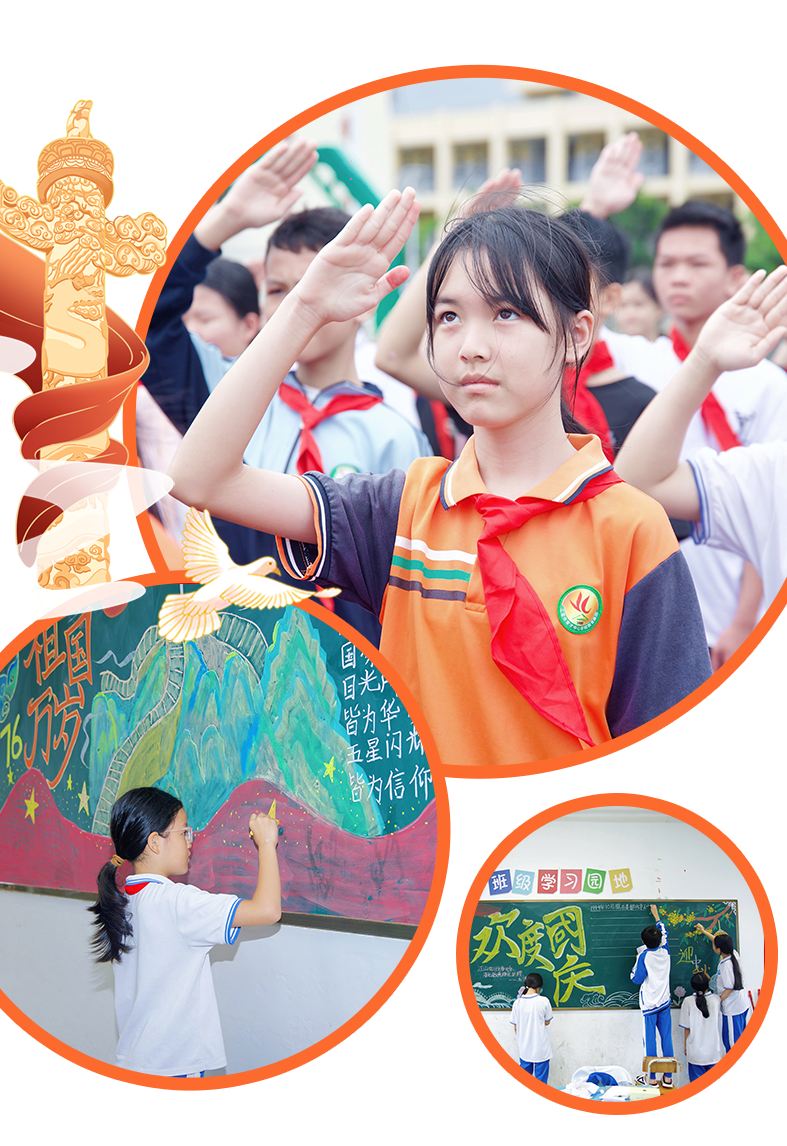 在教室后方,学生们精心绘制的黑板报上,“祖国万岁”“欢度国庆”大字格外醒目,彩色粉笔勾勒的五星红旗、华表,是青春笔尖最真挚的红色宣言。