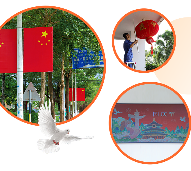 育才的街巷早已被“中国红”点亮。街道两旁,一面面五星红旗连成一片热烈的红,与火红的灯笼串起节日的欢腾;沿街的电子屏上,“祝福祖国”的标语滚动播放,映亮行人驻足的目光。