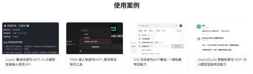 ① 无缝集成,支持4大MCP客户端:支持所有基于MCP-SSE协议的客户端,包括 Cursor、Trae、Dify、Cherry Studio 等主流AI开发工具与对话平台,无需切换系统或编写复杂接口代码,即可在AI工具/系统中直接调用物流能力。