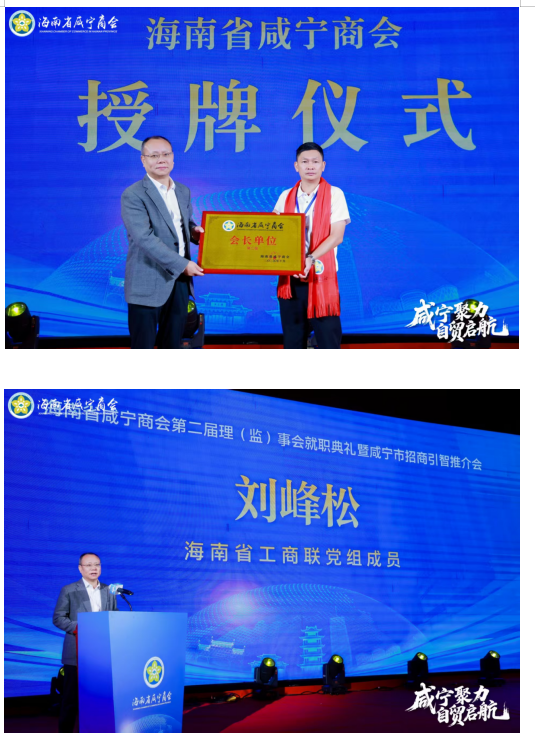 省工商联党组成员刘峰松参加大会,为新任会长授牌并讲话。刘峰松同志代表省工商联充分肯定海南省咸宁商会在促进琼咸两地经贸交流、助力公益事业等方面的成绩,希望商会在海南自贸港封关运作的新阶段,团结带领会员抢抓发展机遇、发挥更大作为,一要坚持政治建会、把稳方向之舵,二要坚持服务兴会、筑牢发展之基,三要坚持团结立会、汇聚共赢之力,四要坚持改革强会、实现更大发展,为商会发展创造更好环境,为海南自贸港建设作出新的贡献。