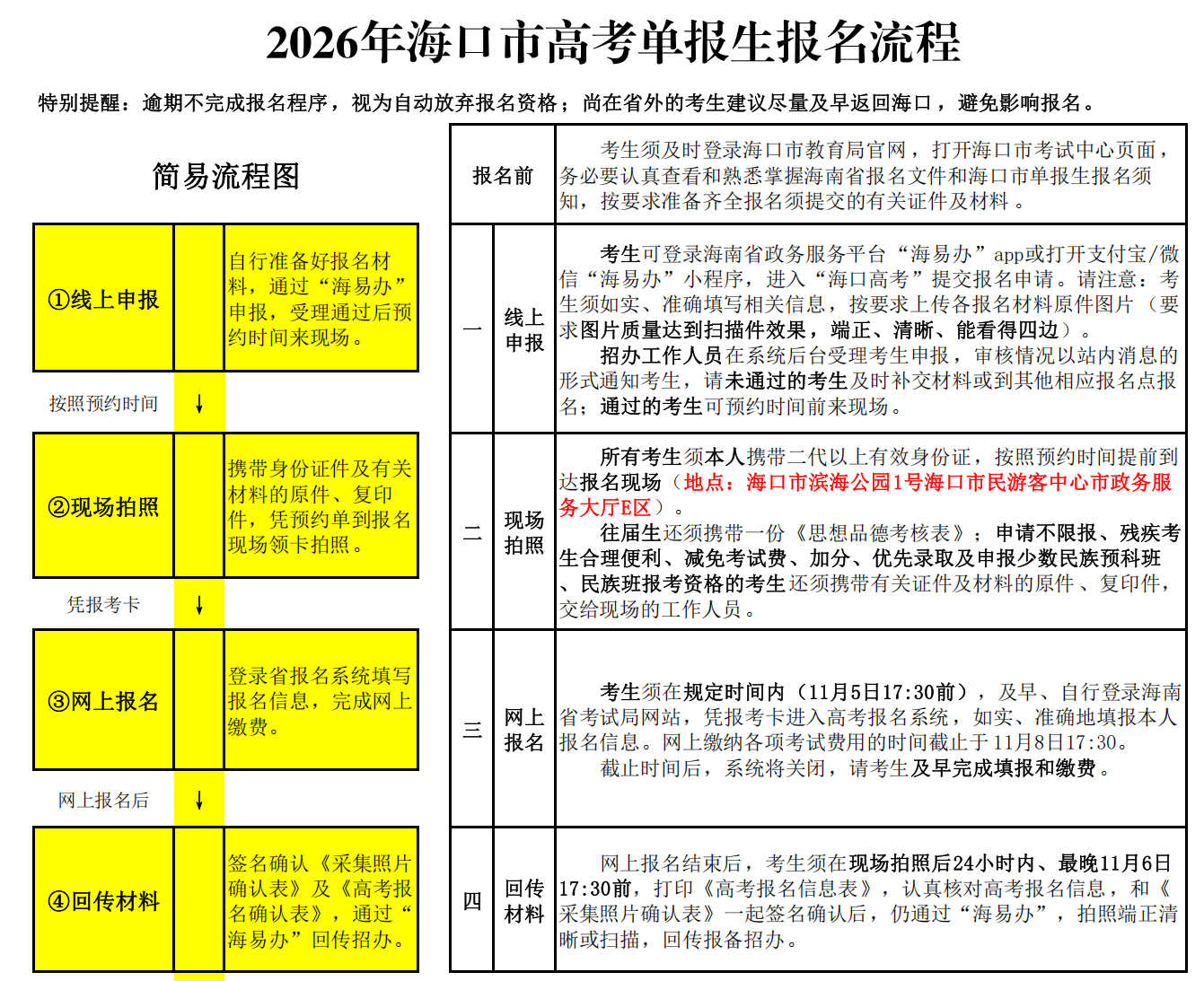 10月27日消息,记者从海口市高招办获悉,2026年海口市高考单报生报名、体检及考试时间已经正式公布,10月28日8:30至11月4日17:30为线上申报时间。