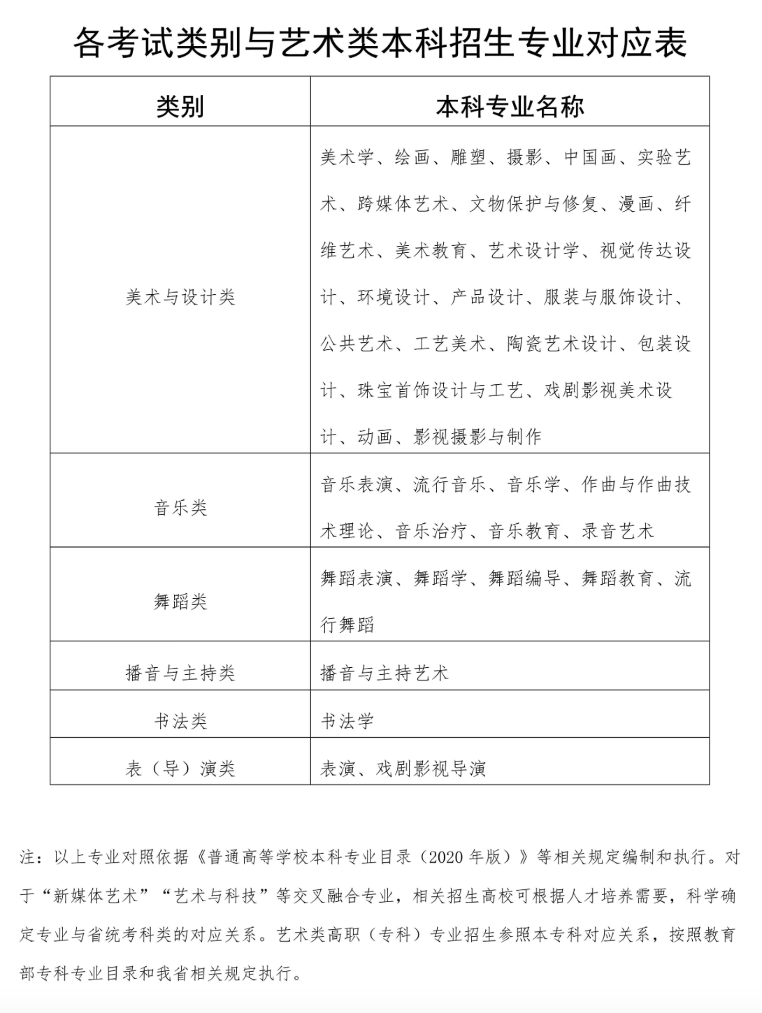 各考试类别与艺术类本科招生专业对应表。海南省考试局供图