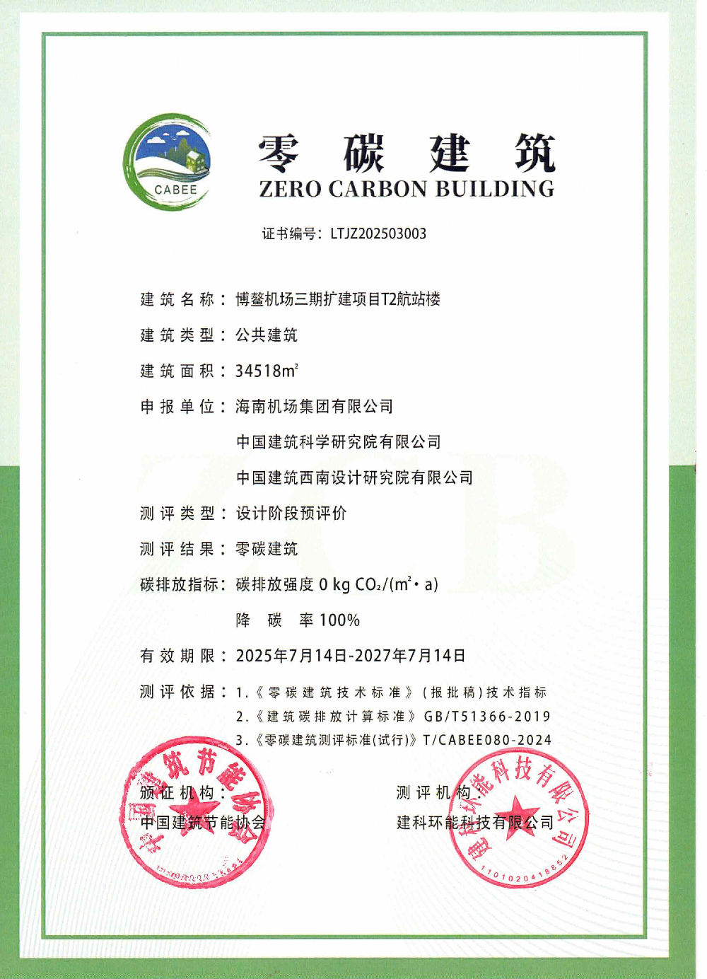 博鳌机场三期扩建项目T2航站楼“零碳建筑”标识。海南机场集团供图
