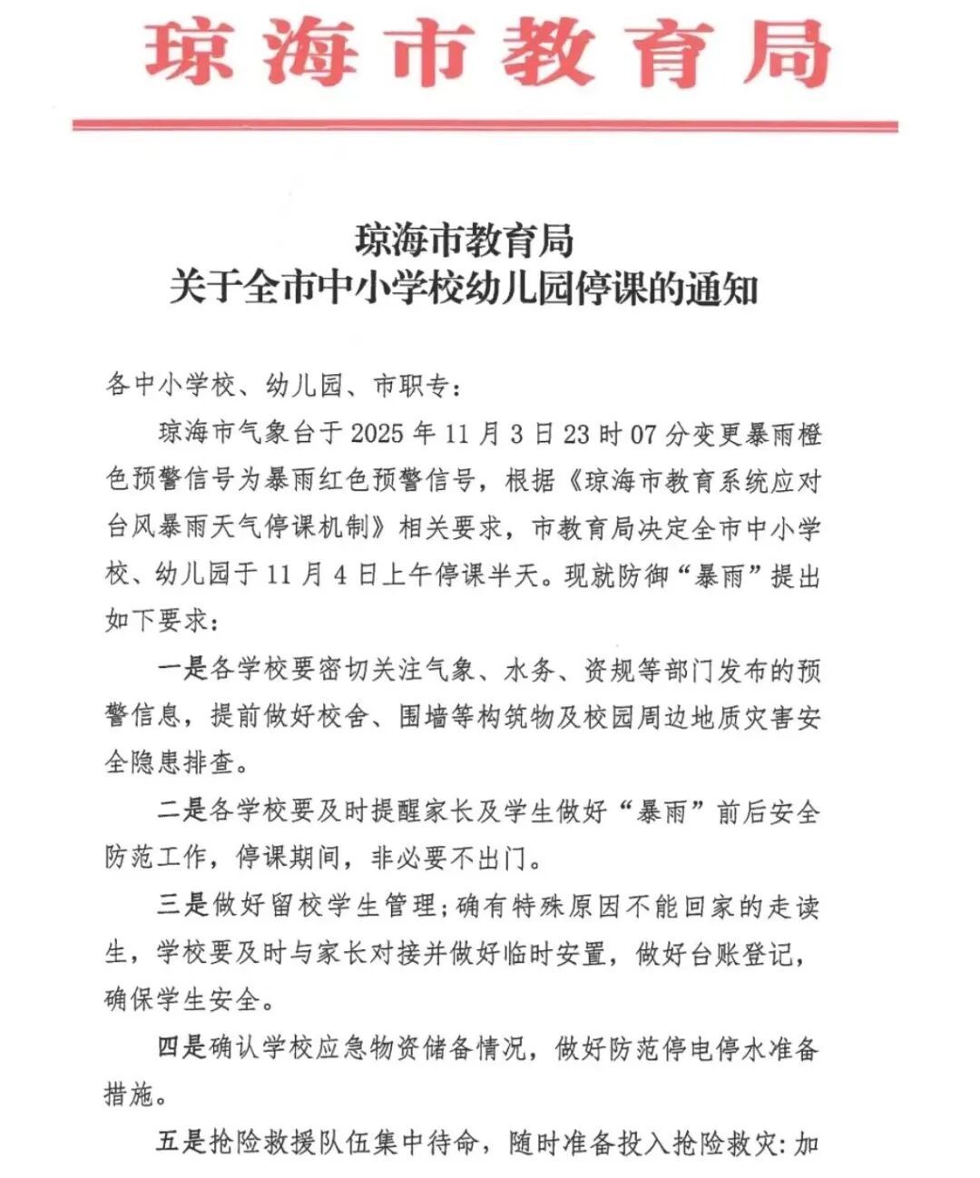 根据最新气象信息,11月4日上午琼海全市降雨量持续较大,经研究决定,琼海各中小学、幼儿园上午停课半天,提醒学生家长请履行好监管责任,避免学生外出活动,防范溺水、坠物等安全风险,返校时间待通知。