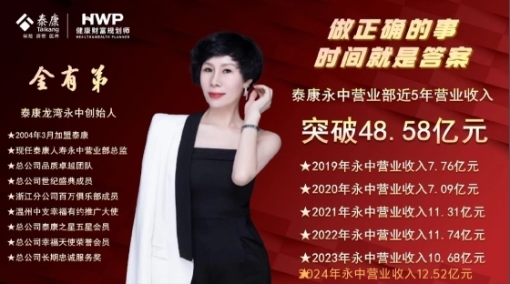2004年3月,金有弟正式加盟泰康人寿,自此开启了与泰康的“长期同行”。在泰康的平台上,她锚定保险保障与财富规划领域,以温州龙湾为起点,一步步搭建团队、拓展业务,最终成为泰康龙湾永中创始人,现任泰康人寿永中营业部总监。