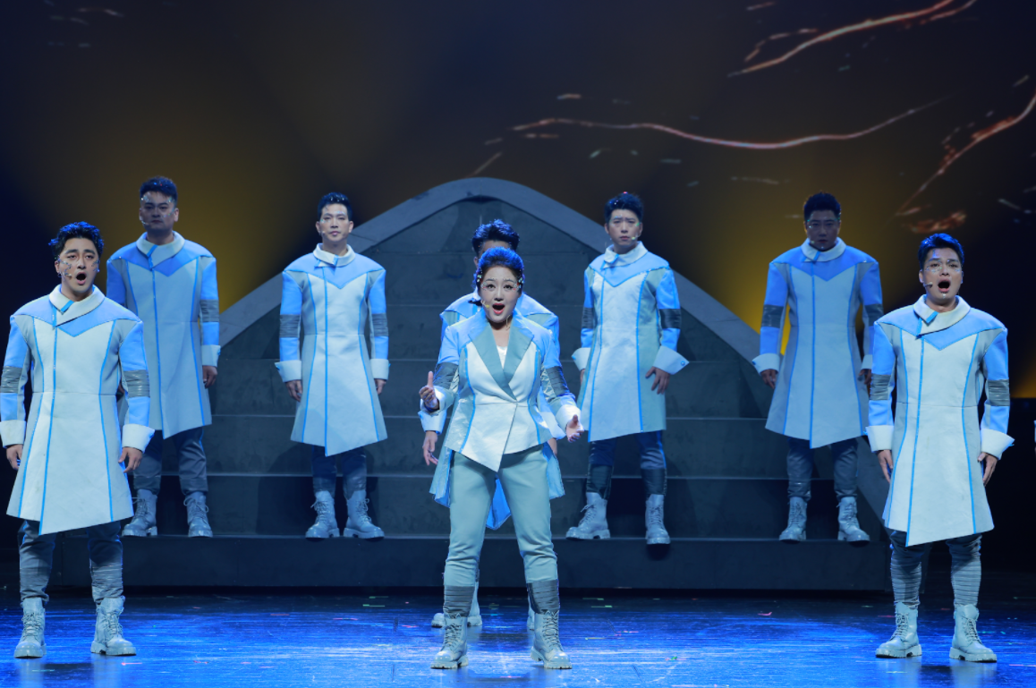 舞台视觉同样彰显匠心,体现深圳特色。LED背景从苍茫群山过渡到蔚蓝海浪,最终定格于高楼林立的都市景观,象征深圳从传统走向现代的完整历程。特别设计的船头造型,呼应“永立潮头”的时代精神;灯光设计上,开场聚光灯突出叙事性,中段蓝色调呼应海洋元素与BLues(蓝调)音乐,结尾的蓝色主基调则象征着梦想的无限延伸;演员服装则采用高科技面料,体现深圳科创之城定位,而结尾以一袭红裙点题,代表党和国家的引领,寓意每个人都是一束光,进一步升华了作品立意。