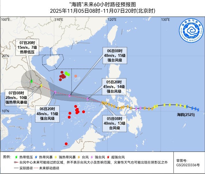 海南省气象局2025年11月5日9时30分继续发布台风四级预警(海上):今年第25号台风“海鸥”(台风级)已于今天(5日)早晨移入南海,08时其中心位于北纬11.6度、东经119.1度,也就是在三沙市永兴岛东南方向约940公里的南海东南部海面,中心附近最大风力13级(40米/秒),七级风圈半径250~330公里,十级风圈半径120~150公里,十二级风圈半径50公里。