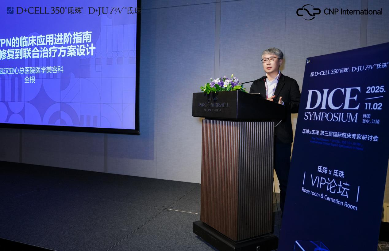 宋大根院长来自韩国747 Clinic,会议中他以《再生的指挥者- PN/PDRN的机制与效果》为演讲主题,从分子机制与临床联合策略角度,系统解析了PDRN与PN的协同作用。二者结合可覆盖从皮肤修复到深层结构重塑的全层次肌肤需求,为难治性皮肤问题提供了新思路。此外,宋院长通过对比不同分子量的渗透性差异,为临床分层治疗提供了精准化应用依据。