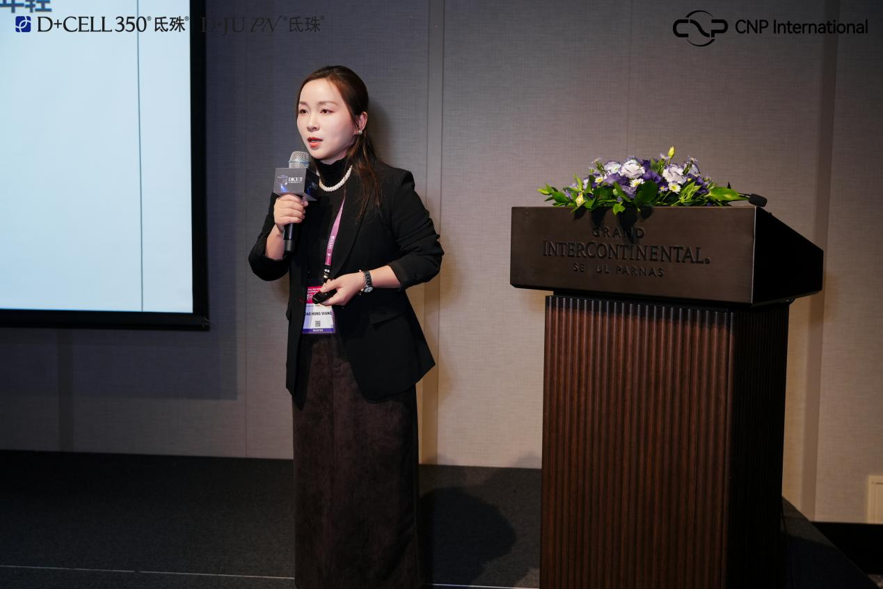 汉娜理事在本次会议中的演讲主题为《赴韩皮肤科新趋势:为什么“双氐”是敏感肌的终极答案?》。她从市场趋势与产品特性双维度论证了双氐对于敏感肌修护的独特优势。她指出,双氐可同步解决敏感肌的泛红、刺痛与屏障受损问题,适用于韩式高浓度酸类焕肤或医美术后的紧急修护,使其成为“皮肤伴侣”与长期维稳的核心选择,契合当前消费者对产品的需求升级。