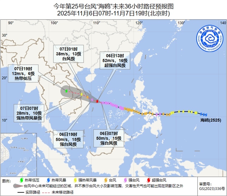 11月6日消息,记者从海南省气象台了解到,今年第25号台风“海鸥”(强台风级)将于11月6日夜间在越南中部一带沿海登陆。另外,今年第26号台风“凤凰”已于11月6日凌晨生成,可能于11日前后将进入南海东北部海面。请在南海中部和西部海域作业的海上平台和船只继续做好避风措施,海南岛中部和东部市县持续做好水库、地质灾害隐患点、工地、漫水桥(路)巡查和安全管理。
