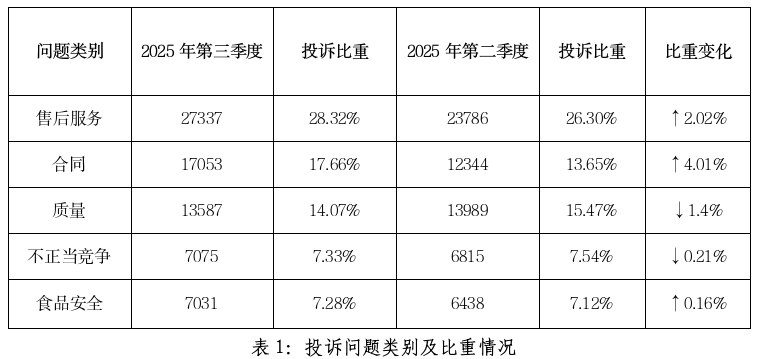 从投诉问题来看,排名前五位的分别是:售后服务类27337件、合同类17053件、质量类13587件、不正当竞争类7075件、食品安全类7031件。与第二季度相比,质量和不正当竞争类投诉占比有所下降,而售后服务和合同类投诉则出现增长趋势。