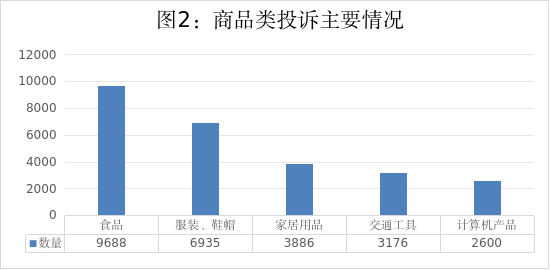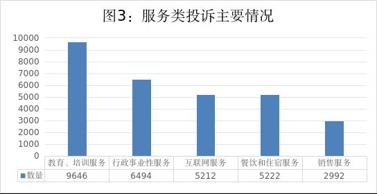 从投诉客体类型来看,商品类投诉共47017件,排名前五位的是:食品9688件、服装鞋帽6935件、家居用品3886件、交通工具3176件、计算机产品2600件。服务类投诉共49526件,排名前五位的是:教育培训服务9646件、行政事业性服务6494件、互联网服务5212件、餐饮和住宿服务5222件、销售服务2992件。