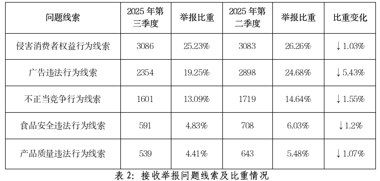 记者了解到,第三季度共受理举报线索12231件。其中,商品类举报线索8094件,服务类举报线索4137件,分别占举报总量的66.18%和33.82%。举报线索排名前5位的分别是:侵害消费者权益行为线索3086件、广告违法行为线索2354件、不正当竞争行为线索1601件、食品安全违法行为线索591件、产品质量违法行为线索539件。