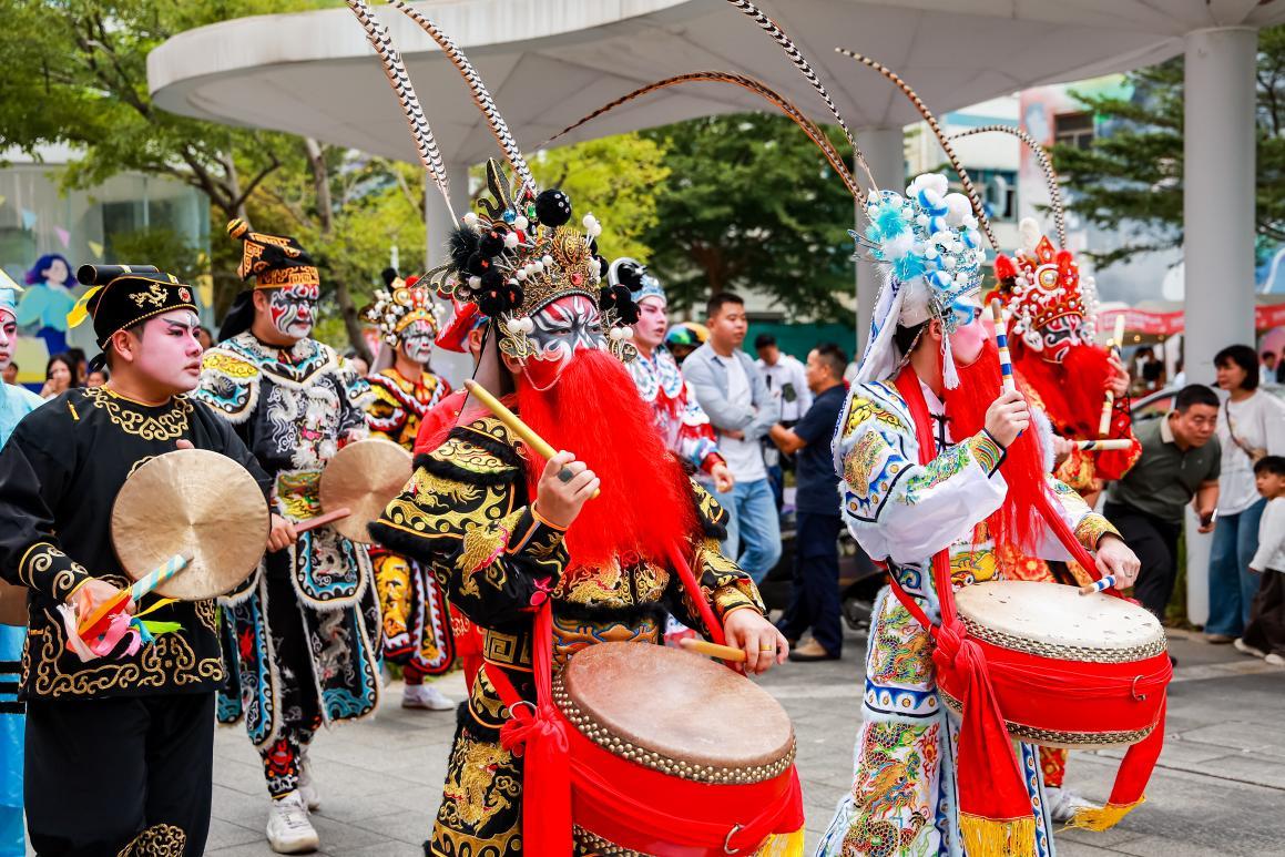 “画上脸谱,挥舞双槌,每个人都是自己故事里的英雄。”36岁的碉楼英歌队领队林润杰说道。他来自潮汕地区,对英歌舞有着深厚感情。活动期间,国家级非遗英歌舞沿街巡演,成为嘉年华吸睛的亮点。舞者们头戴五彩脸谱、手持双棒,踏步甩棒的气势令人震撼。“这种传统非遗与时尚场域的碰撞,正是嘉年华‘时尚+文化+消费’核心主题的体现。”