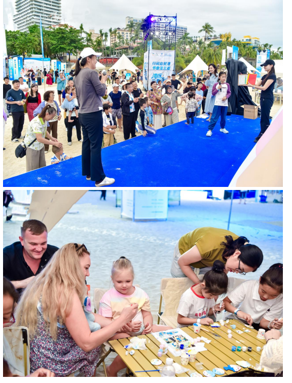 午后的大东海广场化身为一座临海而立的开放式人文空间。现场设置的六大主题体验区,从雅集、游戏到手作、共读,构建了一个立体、多元、沉浸式的阅读文化场域,吸引了众多市民与游客驻足参与。椰林、海浪、书页与人群,共同构筑了一个向海而读的文艺现场。