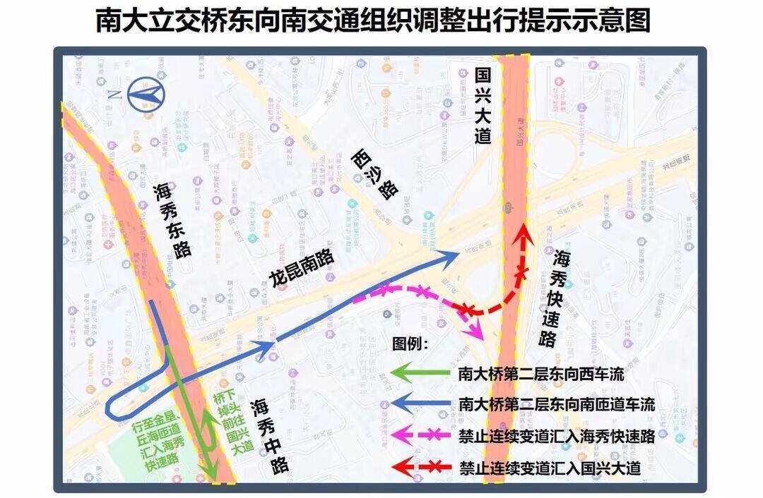 为进一步加强城市道路精细化管理,消除南大立交桥东向南匝道车辆汇流时连续变道、抢行引发的交通事故隐患,改善桥梁行车秩序,提升主线交通运行效率,海口市公安局交通管理支队发布出行提示,自2025年12月22日起,对南大立交桥相关路段交通组织进行调整。