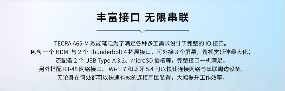 企业办公场景中,商务本常需连接投影仪、外接显示器、U盘、网线等多种设备,若接口不足需额外采购扩展坞,不仅增加采购成本,还可能因扩展坞兼容问题导致设备无法正常使用。TECRA A65-M的“全能接口”设计,完美适配企业现有办公生态:2个Thunderbolt™ 4 Type-C接口(支持数据传输、供电、外接显示)、2个USB 3.2 Type-A接口(1个支持关机充电,可给手机应急补电)、1个HDMI 2.1接口、1个RJ45千兆网口、1个micro SD™卡插槽+1个耳机/麦克风二合一接口。无线连接方面,AMD Wi-Fi 7双频无线局域网(802.11be)传输速度快、信号稳定,即使企业办公区面积大、设备多,也能避免因网络卡顿影响工作;蓝牙5.4技术支持10米内无线耳机连接,中途无断连,适配会议室大空间内的无线音频需求。