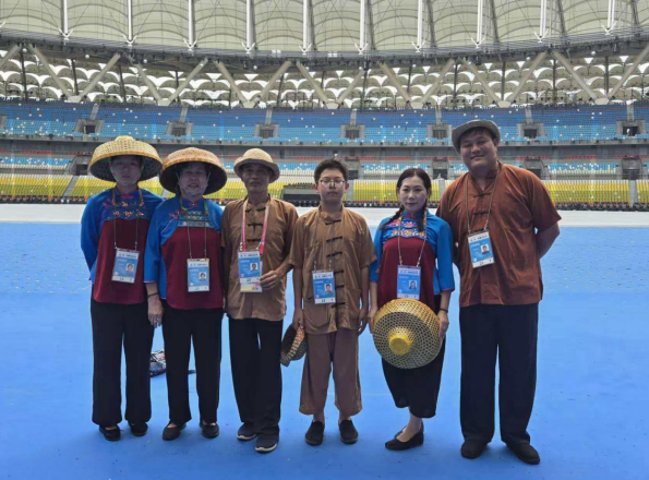 郭何东与其他疍歌传唱人少数民族运动会参与表演合影