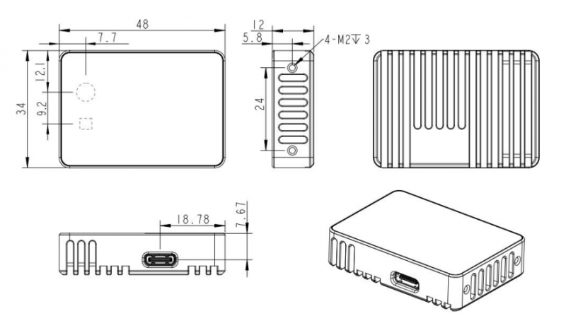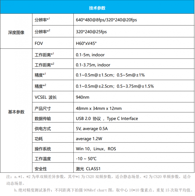 ·硬件规格:VCSEL波长940nm,产品尺寸仅48mm×34mm×12mm,小巧体积可灵活集成于各类机器人,不影响设备整体设计。